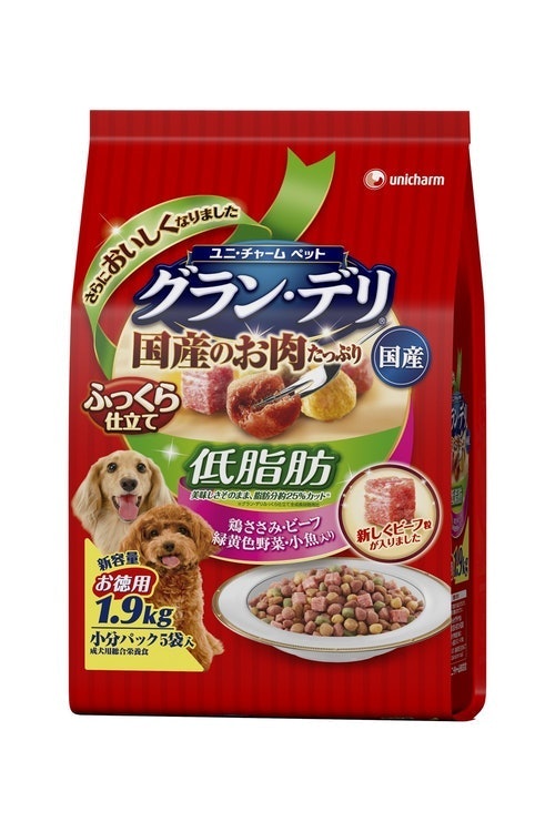 Lohaco グランデリ ドッグフード ふっくら仕立て 低脂肪 ささみ ビーフ 野菜 小魚 角切りビーフ粒入 1 7kg 小分け5袋 国産 1袋 ユニ チャーム