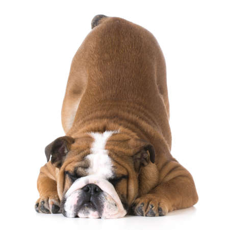 犬お辞儀 の白い背景の上の空気中をホームレスとブルドッグの子犬 の写真素材 画像素材 Image