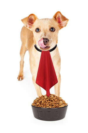 かわいいチワワ混合された品種犬舌を突き出し鼻と唇を舐めていると赤いナプキンを着用します の写真素材 画像素材 Image